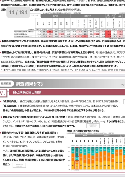 しかし、「何も自己投資していない割合が突出して高い」とか、「自己研鑽意欲の低さが際立つ」とか、大丈夫なんだろうか(;^_^A(ベトナム、インド、タイ、アメリカはすごいぞ。。)